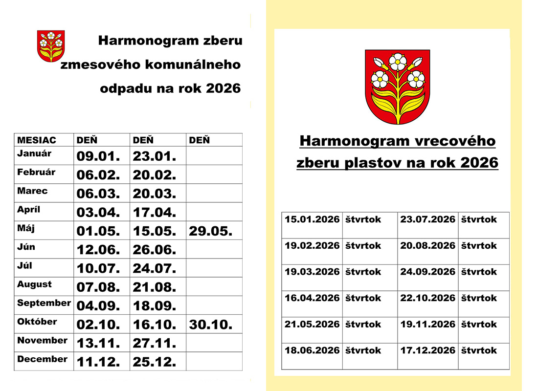HARMONOGRAM zberu PLASTOV a tuhého KOMUNÁLNEHO odpadu v roku 2026 Domov / Udalosti / Začiatok 9. januára 2026 Celodenná udalosť Koniec 25. decembra 2026 Celodenná udalosť