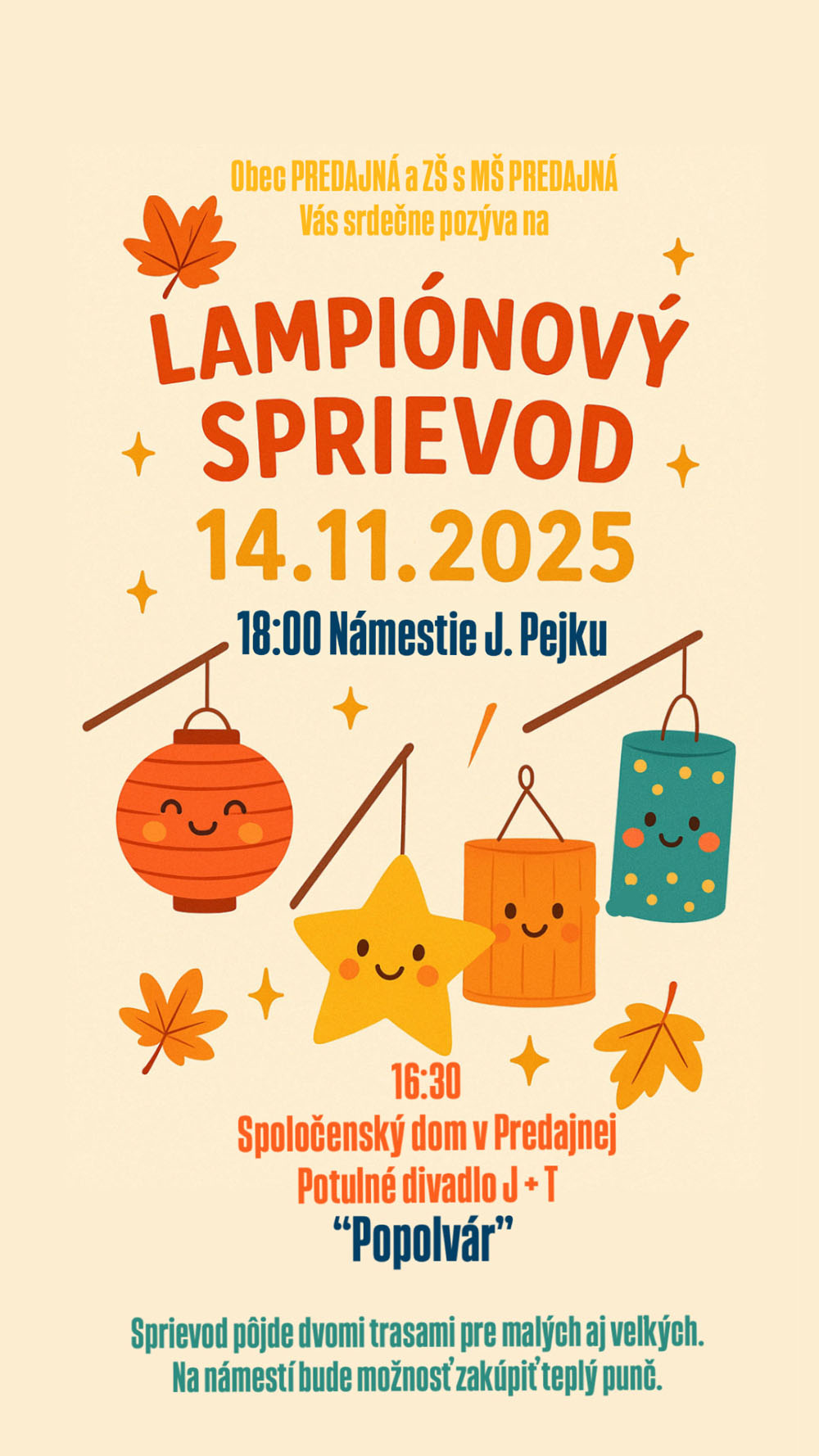Lampiónový sprievod 2025 a divadlo POPOLVÁR pre deti Domov / Udalosti / Dátum 14. novembra 2025 Čas 16:30 - 21:00 Spoločenský dom Predajná 976 63 Predajná Nadchádzajúce udalosti október 2025 Predchádzajúci mesiac Nasledujúci mesiac Po Ut St Št Pi So Ne Preskočit kalendárne dni 29 30 1 2 3 4 5 6 7 8 9 10 11 12 13 14 15 16 17 18 19 20 21 22 23 24 25 26 27 28 29 30 31 1 2 3 4 5 6 7 8 9 Naspäť na kalendárne dni Viac udalostí