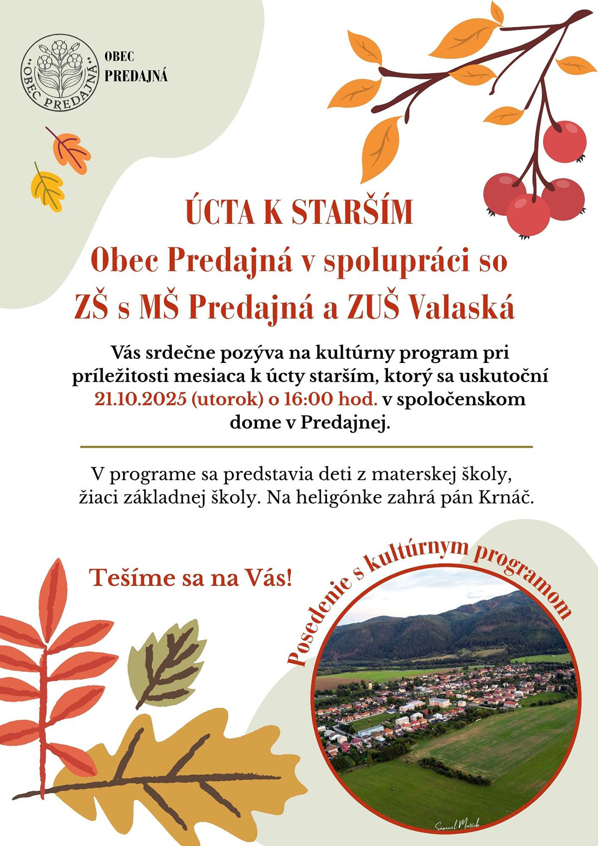 Mesiac úcty k starším 2025 Domov / Udalosti / Dátum 21. októbra 2025 Čas 16:00 - 21:00 Spoločenský dom Predajná 976 63 Predajná